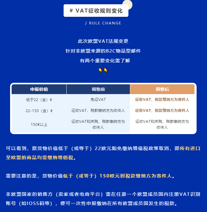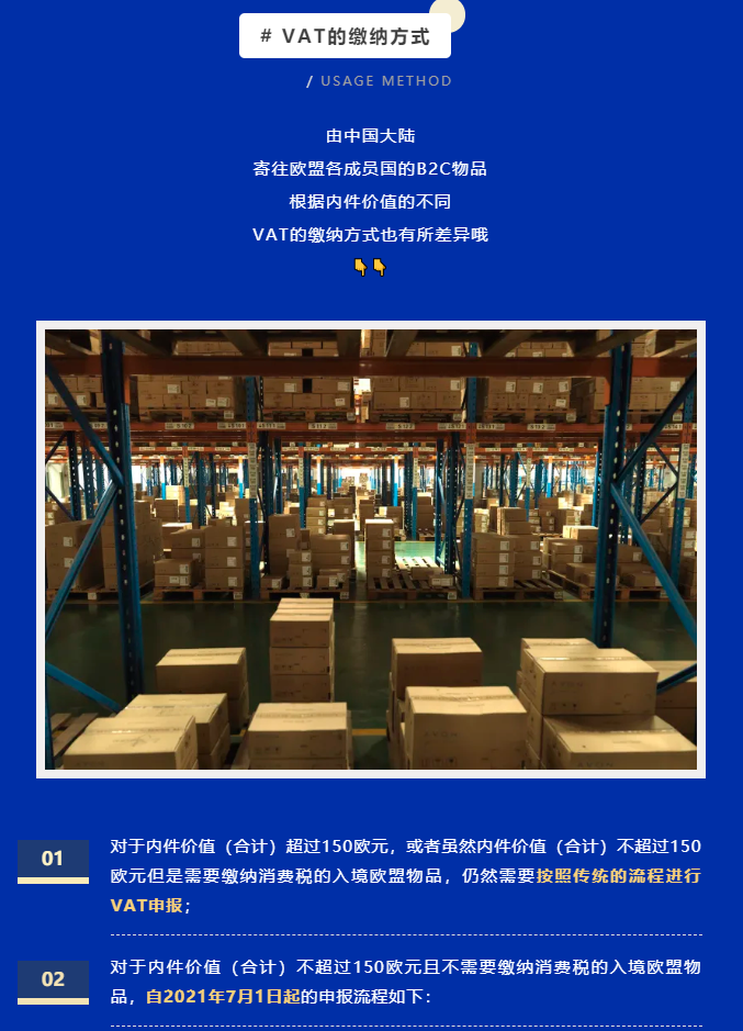 对于内件合计价值超过150欧元的物品,或者内件合计价值不超过150欧元但需要缴纳消费税的物品,卖家或者平台无需提前申报VAT,邮件抵达欧盟海关时,海关会通知收件人按要求缴税并放行。